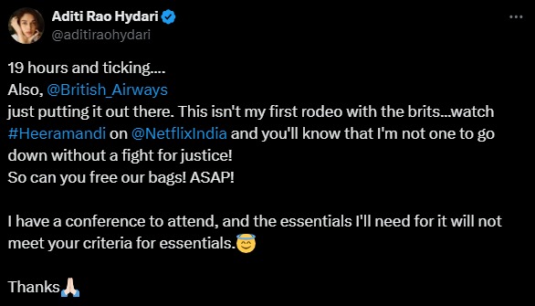 యూకే విమానశ్రయంలో బాలీవుడ్ నటి అదితి రావు (Aditirao) హైదరీకి చేదు అనుభవం ఎదురైంది. ప్రయాణం అనంతరం తన లగేజీ మాయమైందని, దానికోసం గంటల తరబడి వెయిట్ చేయాల్సి వచ్చిందని ఆవేదన వ్యక్తం చేసింది. దీనిపై ఎయిర్ పోర్ట్ అధికారులను సంప్రదిస్తే.. వారు చేతులెత్తేశారని పేర్కొంది. సంబంధిత ఎయిర్లైన్ ను సంప్రదించమన్నారని తెలిపింది. ఇక ఎయిర్ పోర్ట్ సర్వీసులపై ఆసహనానికి గురైన అతిది (Aditirao).. ఇంత చెత్త ఎయిర్పోర్టును తానెప్పుడూ చూడలేదంటూ ఆగ్రహం వ్యక్తం చేసింది. గంటలకొద్ది ఎయిర్ పోర్టులో టైమ్ అంతా వృదాగా పోయిందని వాపోయింది. సిబ్బంది ఇంత నిర్లక్ష్యంగా ఎలా వ్యవరిస్తారని మండిపడింది. దీనిపై ఇన్ స్టా వేదిగా ఓ పోస్ట్ పెట్టింది అతిది. ప్రస్తుతం ఈ పోస్ట్ సోషల్ మీడియాలో వైరల్ గా మారింది. ఇక సినిమాల విషయానికొస్తే.. రీసెంట్ ఈమె నటించిన హీరామండి: ది డైమండ్ బజార్ సినిమా మంచి విజయాన్ని సొంతం చేసుకుంది. అందులో అతిది బిబ్బోజాన్ పాత్రలో నటించి మెప్పించింది. ప్రస్తుతం ‘గాంధీ టాక్స్’ ‘లయనెస్’ సినిమాలో నటిస్తోంది. అదే విధంగా అతిది రావు హైదరీ.. -నటుడు సిద్ధార్థ్ను త్వరలోనే పెళ్లి చేసుకోనుంది.