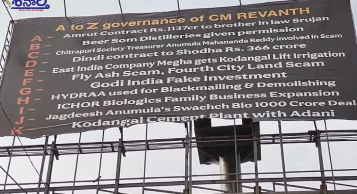 ఫ్లెక్సీలో “ఏ టు జెడ్ అక్రమాలు” అన్న శీర్షికతో రేవంత్ రెడ్డి పాలనపై ఆరోపణలు ముద్రించబడ్డాయి. ఇందులో ఆయన అధికారంలోకి వచ్చిన తర్వాత జరిగిన వివిధ అక్రమాలు, అవినీతికి సంబంధించిన పాయింట్లు ప్రస్తావించబడ్డాయి. ఈ ఫ్లెక్సీ ఏర్పాటుచేసిన వ్యూహం వెనక ఎవరు ఉన్నారన్నది ఇప్పటికీ తెలియలేదు.
