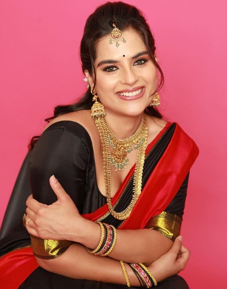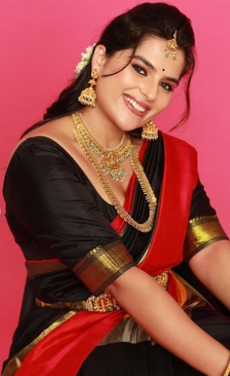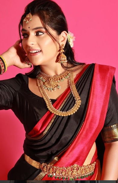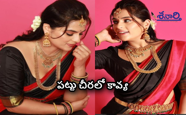గంగోత్రి సినిమాలో బాలనటిగా టాలీవుడ్ లోకి ఎంట్రీ ఇచ్చింది కావ్య కళ్యాణ్ రామ్(Kavya Kalyanram ). ఈ సినిమాలో వల్లంకి పిట్ట సాంగ్ తో ఇక్కడి ప్రేక్షకులను ఎంతగానో ఆకట్టుకుంది. ఆ తర్వాత పవన్ కళ్యాణ్ హీరోగా వచ్చిన బాలు సినిమాలోనూ నటించి మెప్పించింది. ఇక వేణు డైరెక్షన్ లో వచ్చిన బలగం సినిమాతో ఒక్కసారిగా పాపులర్ అయింది. ఈ సినిమా భారీ హిట్ కావడంతో టాలీవుడ్ లో వరుస అవకాశాలు అందుకుంది. ఇటీవల ఉస్తాద్ అనే సినిమాలో ఈ బ్యూటీ నటించింది. అటు సినిమా షూటింగ్ లో ఫుల్ బిజీగా ఉంటూనే.. సోషల్ మీడియాలోనూ యాక్టివ్ గా ఉంటోంది కావ్య(Kavya Kalyanram ). తన లేటెస్ట్ ఫొటోలను ఇన్ స్టాలో ఫ్యాన్స్ తో పంచుకుంటోంది. తాజాగా బ్లాక్ అండ్ రెడ్ పట్టు చీరలో మంచి నగలు ధరించి సంప్రదాయబద్దంగా ఫొటోలకు ఫోజులచ్చింది ఈ బ్యూటీ.